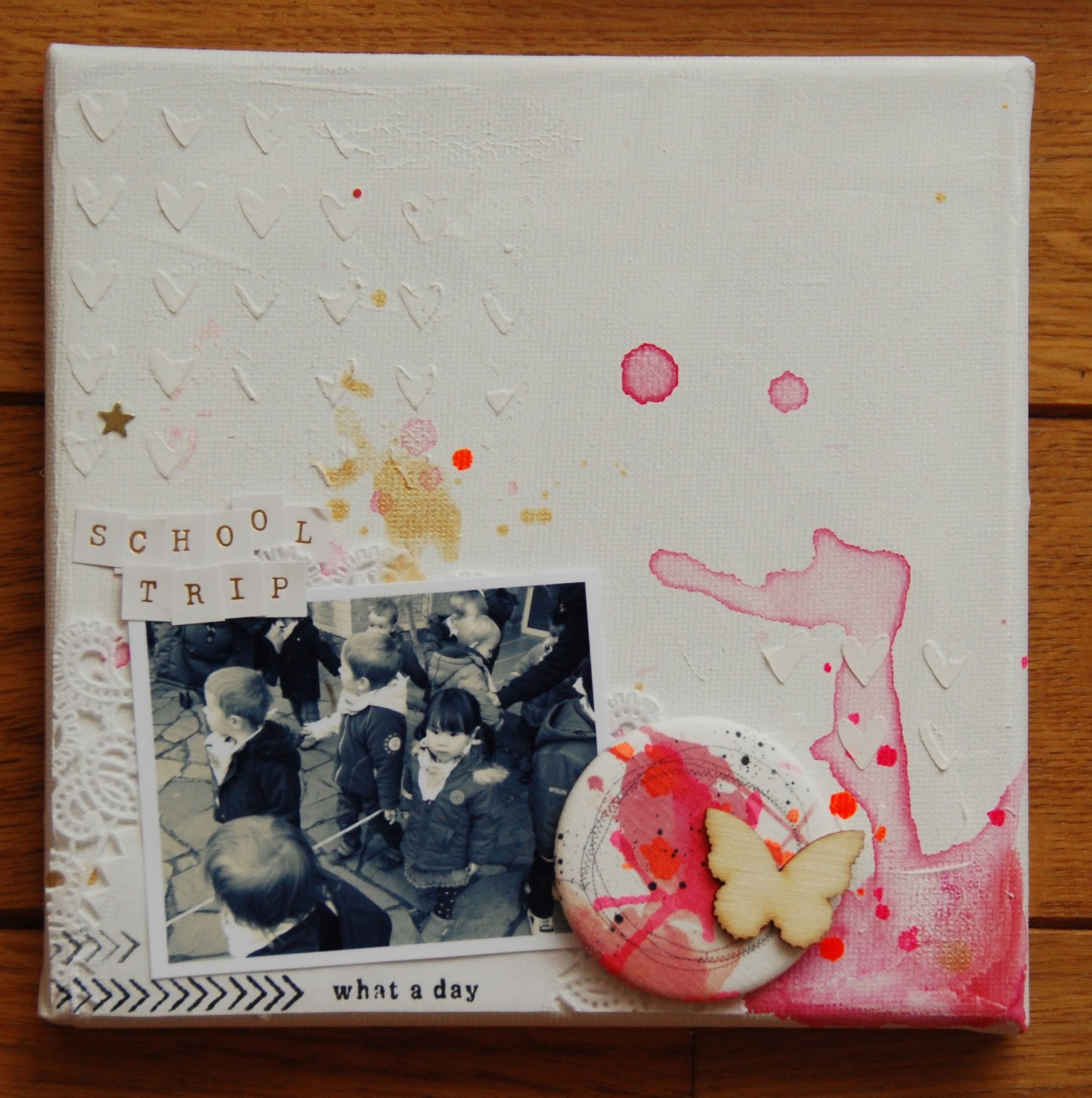 Et pour le combo, j'ai choisi du rose et doré avec une toute petite pointe de orange fluo! Et sinon on vrac il y a des badges SCRAPButtons (les nouveautés sont arrivées la bas d'ailleurs, alors allez vite faire un tour sur la boutique pour les découvrir!!!), des encres fluo Mr Huey, des Alpha American Crafts, des découpes bois Scattered conffeti et Studio Calico, du MT fluo, des tampons american Crafts et de la modeling paste appliquée sur le joli mask coeur de Pause Créative (qui a disparu depuis lors... le mystérieux triangle des bermudes que 'lont trouve dans chaque scraproom et qui fait disparaitre systématiquement THE truc que vous voulez utiliser...)